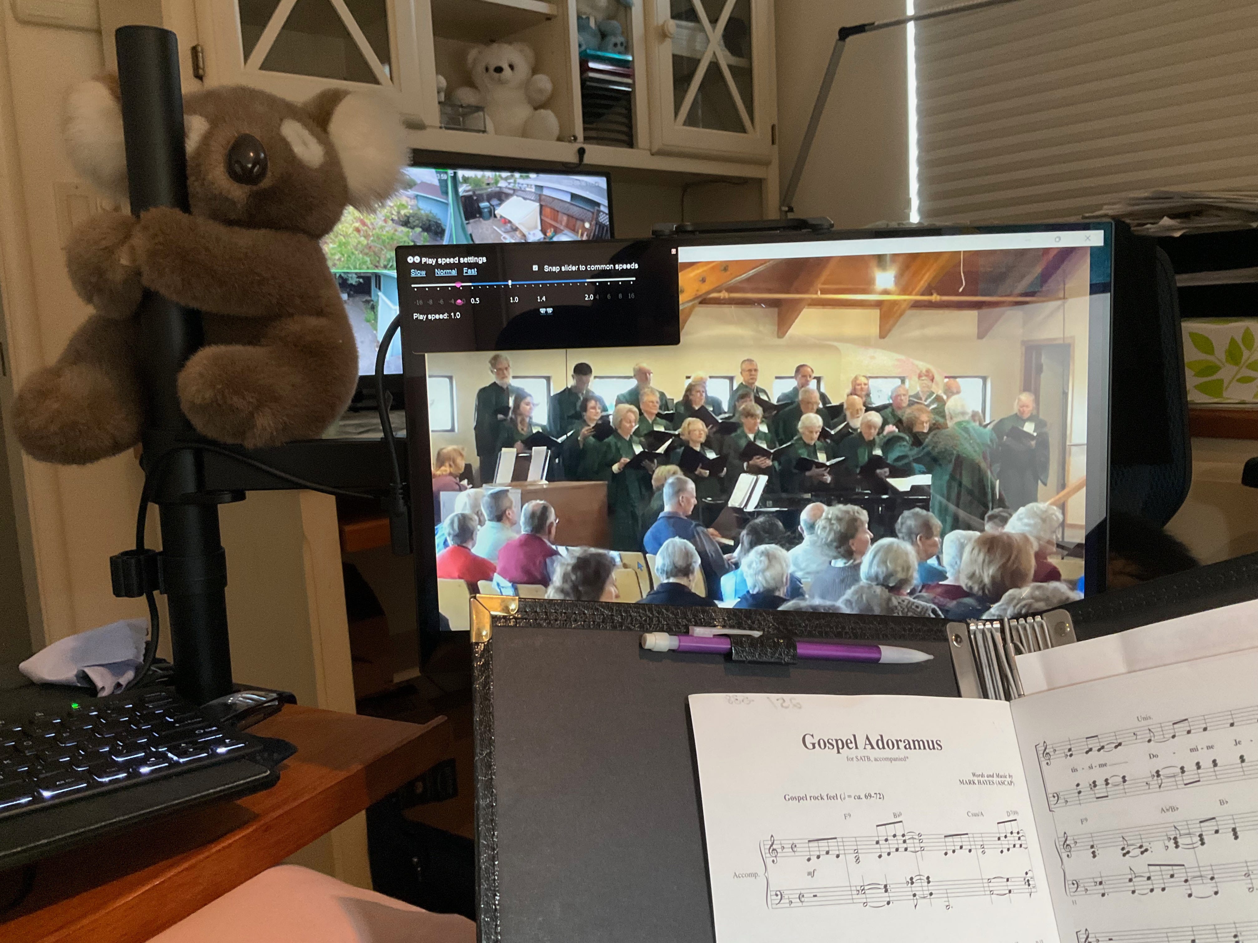 The main monitor shows another choir singing the same piece, downloaded from YouTube, along with a speed control. I started out slow and worked my way up until my lips quit trying to leave my face, and I had most of the notes right. And this was the day before we sang. We had had plenty of rehearsals, sectionals even (we don’t usually need to do those). This piece was unusually hard to learn. Or maybe I’m just too old for this. I don’t care.