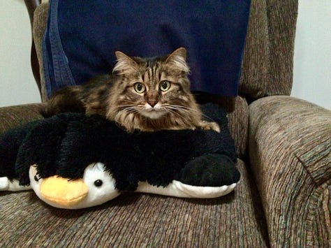 Our smallest (she's 4 I think now), Lizzie, is all black except her right rear foot has a few toe-tips that are white. I consider her our 'LARPer'. She appears to spend about half of her waking hours in the sincere belief that she is some sort of sleek, larger rain forest cat. She acts panther-ish. She's quite the shouter as well, but she's more of a proclaimer of her existence than she is a parading victor.