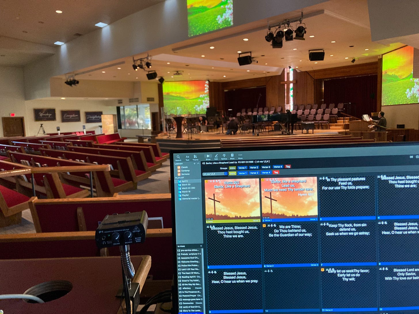 The lyrics timing was a little choppy because I had limited opportunity to practice the precise turns. I noticed that there were also issues with how the lyrics looked, but I don’t create the slides and I don’t have time to proof and correct the “lower 3rds” feed to the livestream booth, so what you see is what I receive from the team, and the present console configuration does make lower thirds somewhat difficult to proof.