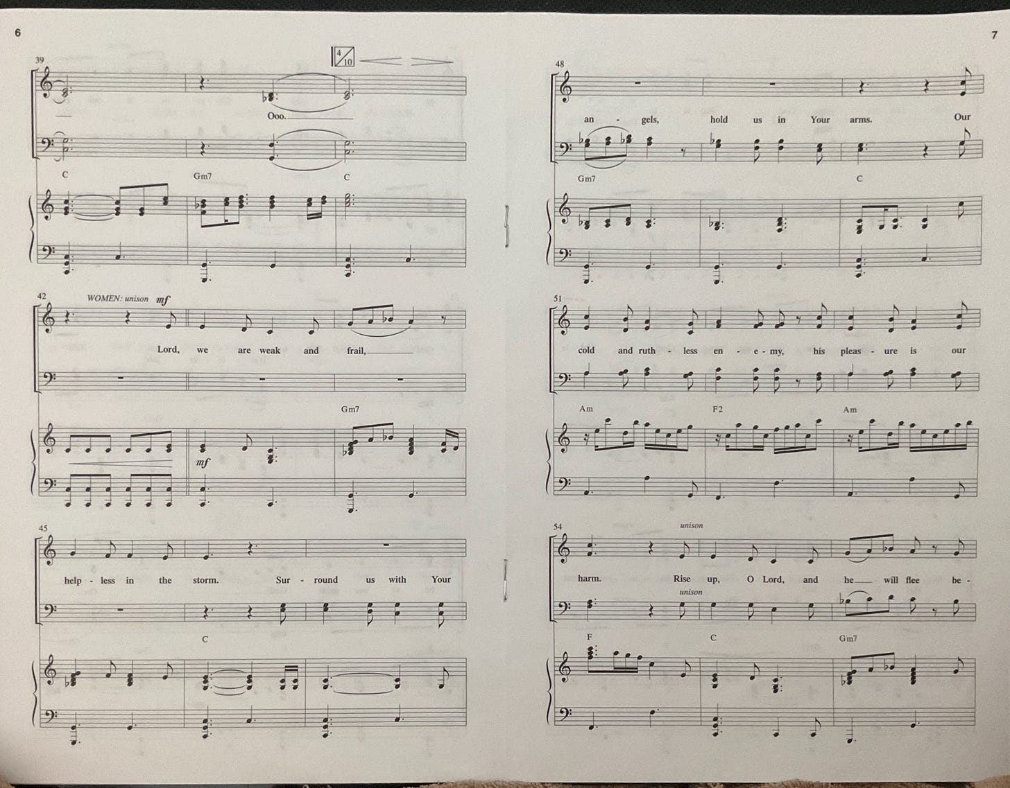This is the second time this year my choir has sung this wonderful anthem. It’s not only the sound, but the words, some of which are particularly appropriate in this time in which we find ourselves. “Our cold and Ruthless enemy, His pleasure is our harm / Rise up, O Lord, and he will flee Before our sovereign God.“ Here is the choral music for that portion: (left brackets are vocals, braces are piano)